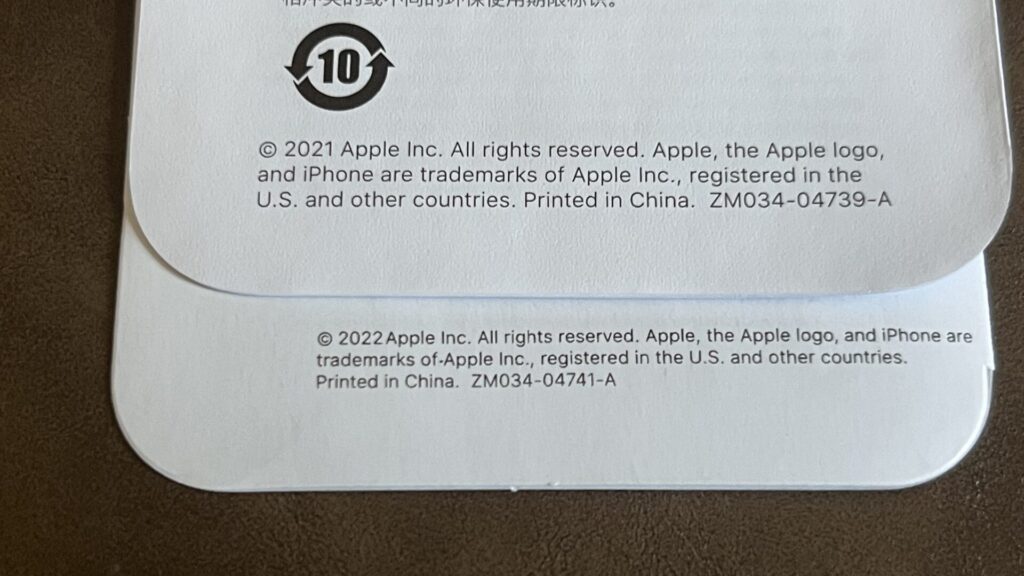 本物(上)は「2021 Apple Inc.」で、偽物(下)は「2022Apple Inc.」。